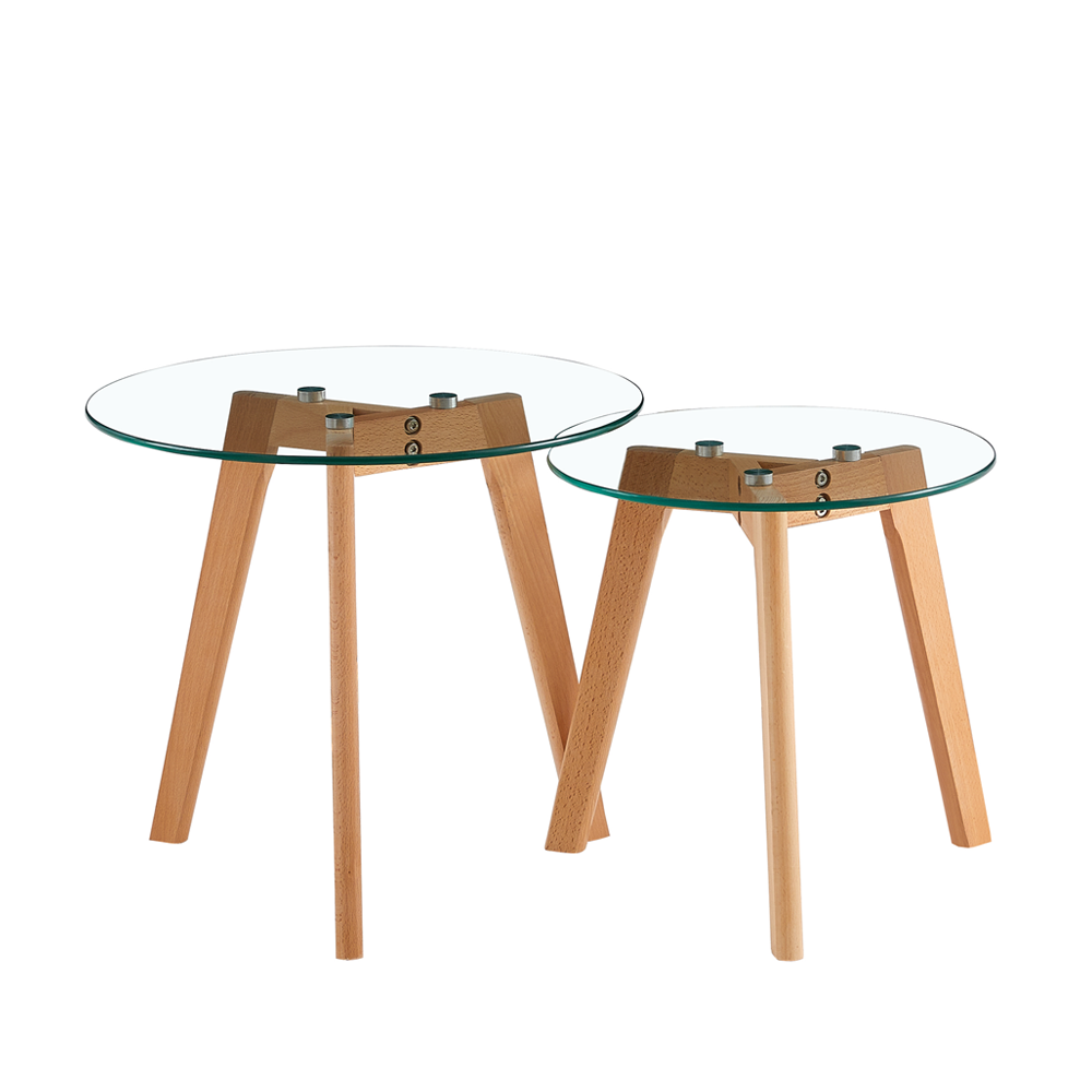 Set de mesas practicas,  estructura madera color haya con top de vidrio transparente templado, espesor 0.8cm.