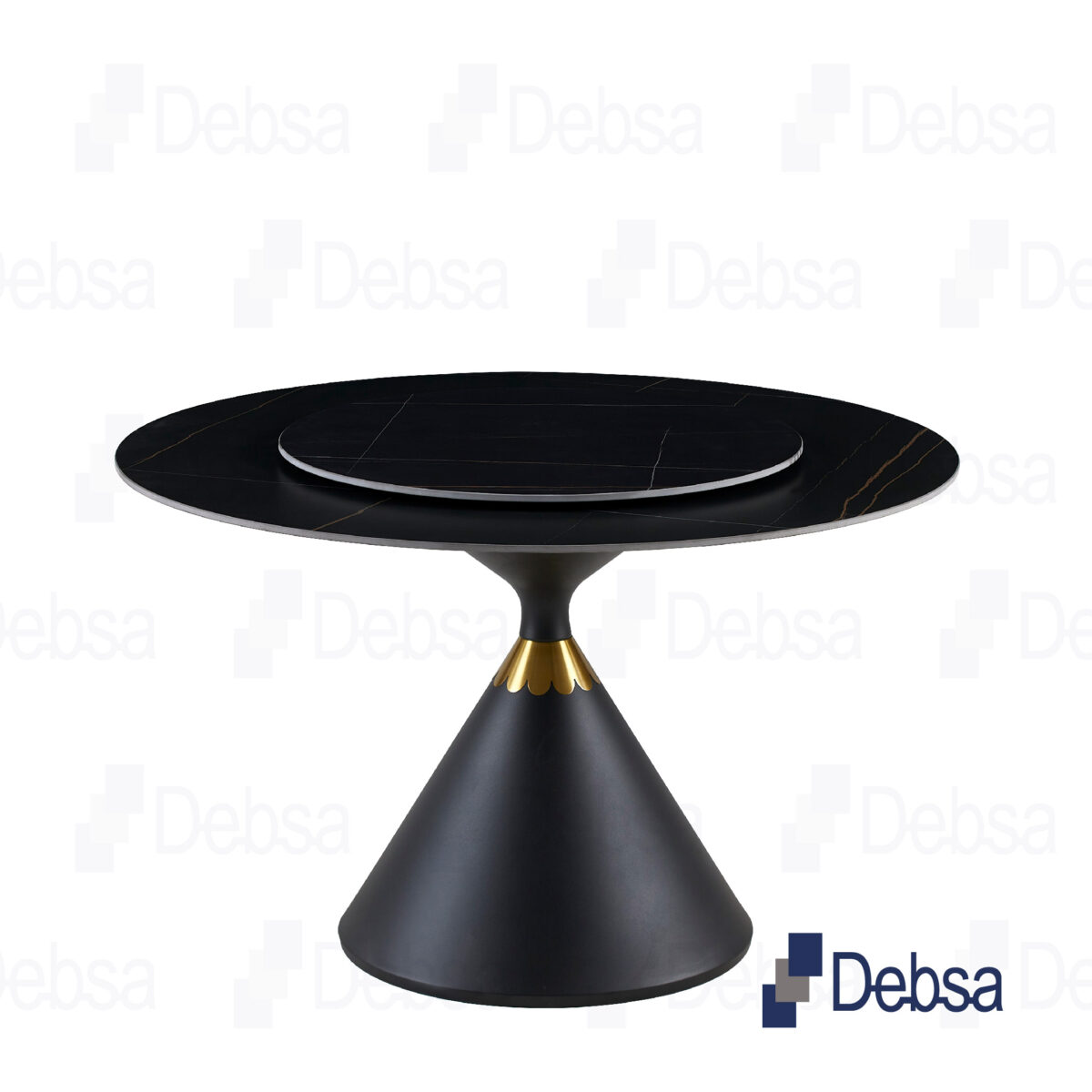 Mesa estilo nordico, estructura de metal pintado. Top de doble encimera, una giratoria de 80cm de diametro y top base de 130cm de diametro con 12mm de espesor. Ambos hechos de piedra sinterizada, materiales que le dan elegancia y confort a la mesa.